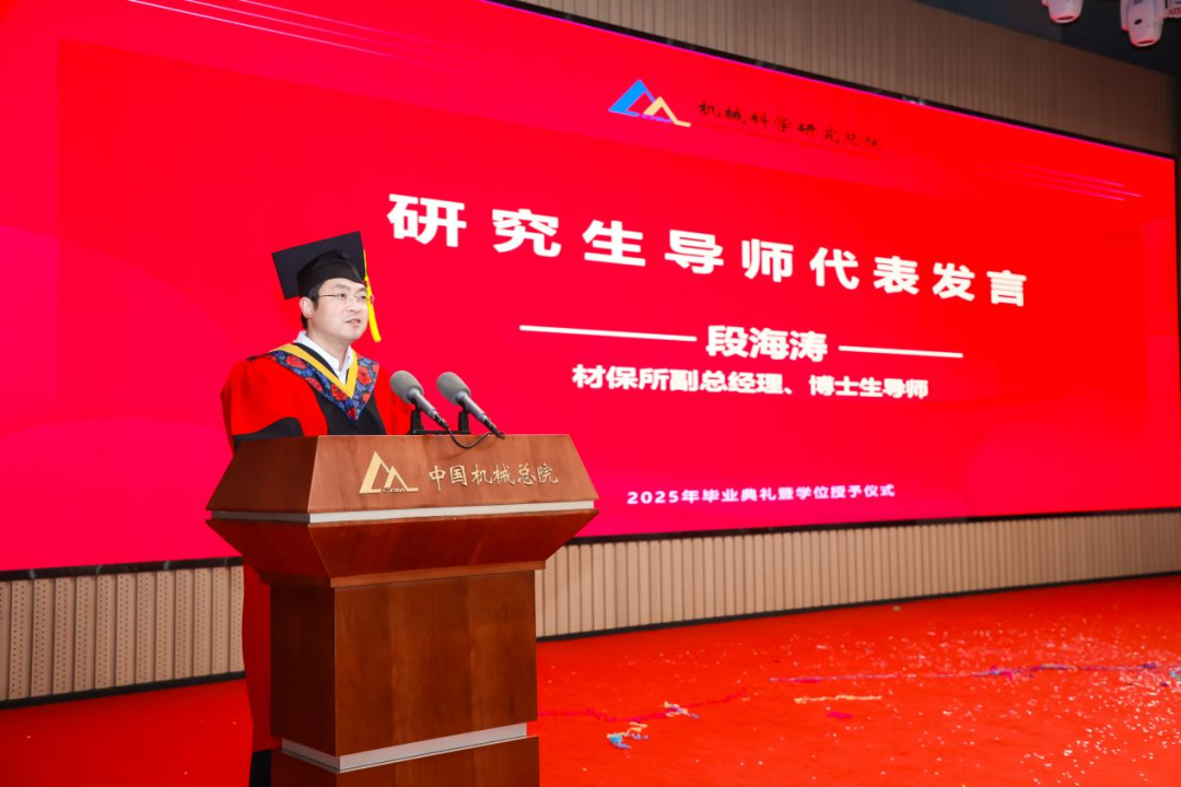 材保所副總經(jīng)理、博士生導(dǎo)師段海濤作為導(dǎo)師代表發(fā)言,為全體畢業(yè)生送上囑托和期望。他希望同學(xué)們樹立“大志向”、堅守“大擔(dān)當(dāng)”、秉持“大情懷”,用真才實(shí)學(xué)鐫刻屬于自己的璀璨印記。